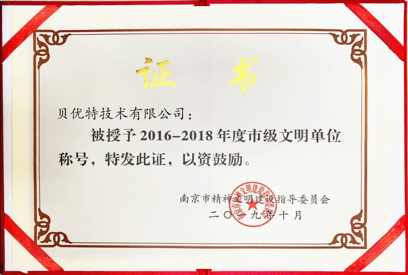 公司獲得了由南京市精神文明建設指導委員會頒發(fā)的2016-2018年度南京市文明單位獎牌和獲獎證書,這是對我們過去兩年公司文化工作的肯定,必將激勵我們繼續(xù)前行。